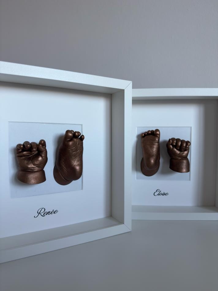 Hand en voetafdruk afgewerkt in een kader met naam en/of geboortedatum.